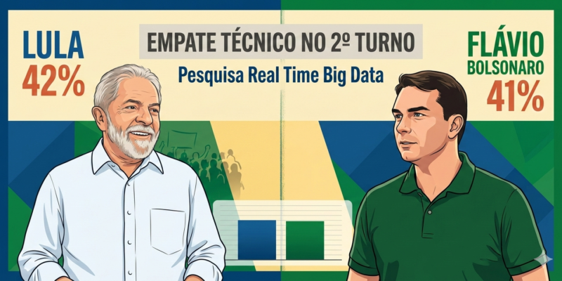 A pesquisa Real Time Big Data, divulgada nesta terça-feira (3 de março), confirmou um cenário de acirrada disputa presidencial para 2026. No cenário de primeiro turno mais testado — incluindo Ratinho Junior (PSD) — Lula aparece com 39% das intenções de voto, seguido por Flávio Bolsonaro com 32% e o governador paranaense com 9%.